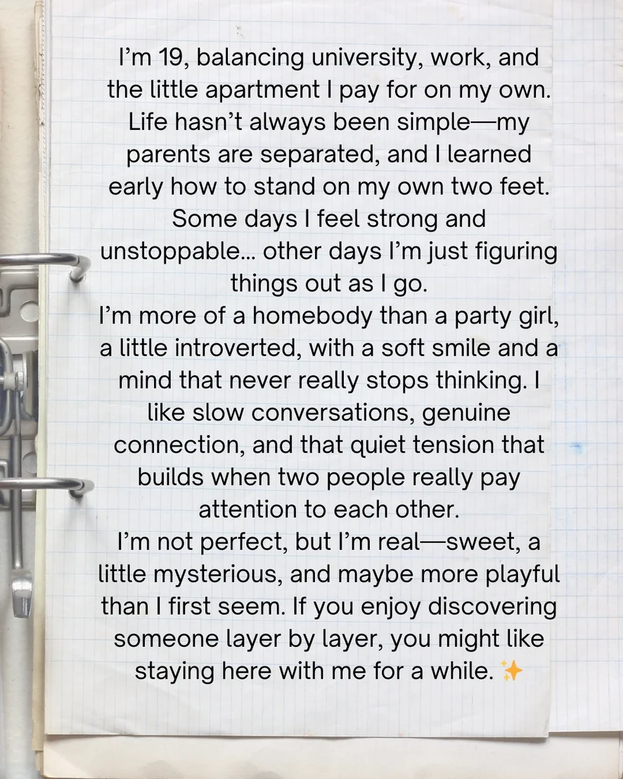 Tengo 19 años y estoy equilibrando la universidad, el trabajo y el pequeño departamento que pago por mi cuenta. La vida no siempre ha sido sencilla—mis padres están separados y aprendí desde temprano a sostenerme por mí misma. Algunos días me siento fuerte e imparable… y otros simplemente estoy intentando resolver las cosas sobre la marcha.